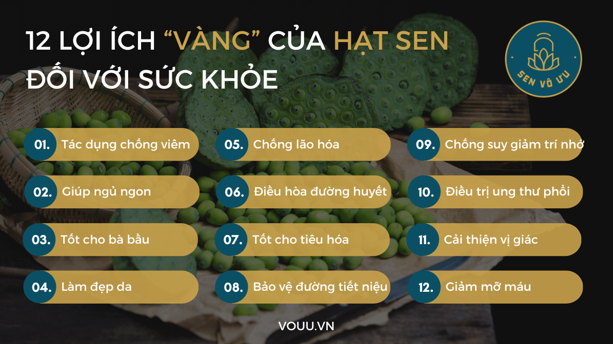 Dưới đây là 12 công dụng, được ví như “lợi ích vàng” của long nhãn ôm sen đối với sức khỏe con người. Mời bạn cùng Sen Vô Ưu tìm hiểu những công dụng của hạt sen trong bài viết này nhé.