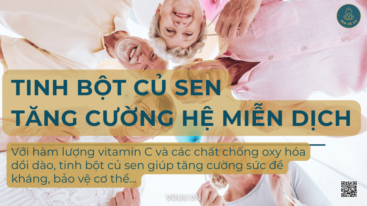 Hệ miễn dịch suy yếu là một trong những nguyên nhân khiến người cao tuổi dễ mắc bệnh. Với hàm lượng vitamin C và các chất chống oxy hóa dồi dào, tinh bột củ sen giúp tăng cường sức đề kháng, bảo vệ cơ thể khỏi các tác nhân gây bệnh như vi khuẩn, virus. Sử dụng tinh bột củ sen thường xuyên giúp người cao tuổi duy trì sức khỏe ổn định và phòng ngừa bệnh tật.
