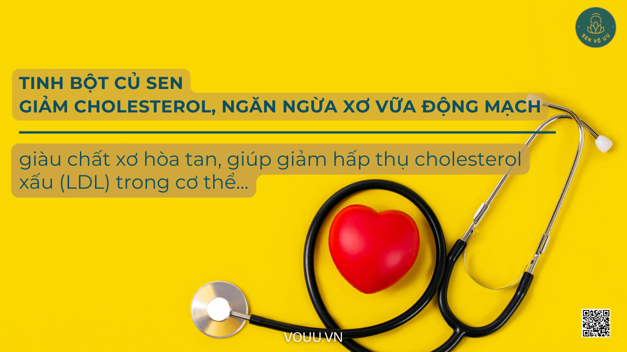 Người cao tuổi thường có nguy cơ cao mắc các bệnh về tim mạch như cao huyết áp, xơ vữa động mạch. Tinh bột củ sen giàu kali, giúp điều hòa huyết áp và hỗ trợ chức năng tim mạch. Đồng thời, chất xơ trong tinh bột củ sen giúp giảm cholesterol xấu, ngăn ngừa nguy cơ đột quỵ và các bệnh lý liên quan đến tim mạch.
